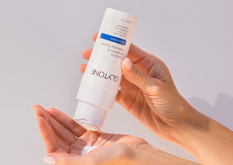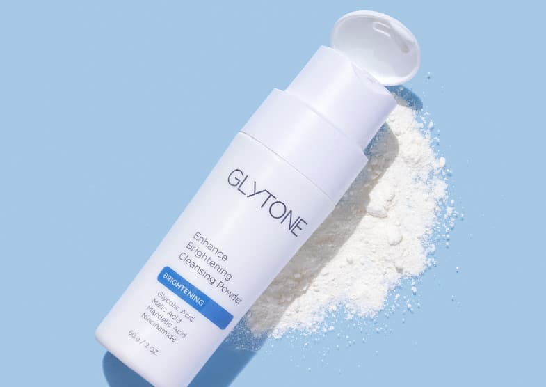Enhance Brightening Cleansing Powder combines physical (powder) and chemical exfoliants (Glycolic Acid, Mandelic Acid and Malic Acid) to remove dead skin cells and renew the skin. It also contains Niacinamide to help reduce dark spots. If tolerated, this Glycolic Acid cleanser can be used twice a day to keep your skin radiant and glowing.