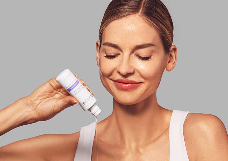 A chemical exfoliant uses different acids to weaken the "glue" holding dead skin cells together. Once the "glue" is broken down, the cells are gently and easily washed away. These exfoliants are suitable for all skin types, especially sensitive and acne-prone skin. There is less risk of damaging the skin with a chemical exfoliant. Some are low-strength and suitable for daily use, while others are used less frequently. Chemical exfoliants include alpha-hydroxy acids (AHA), like Glycolic Acid, Lactic Acid or Mandelic Acid, beta-hydroxy acids (BHA), like Salicylic Acid, and poly-hydroxy acids (PHA). They are available in exfoliating serums, creams and cleansers.